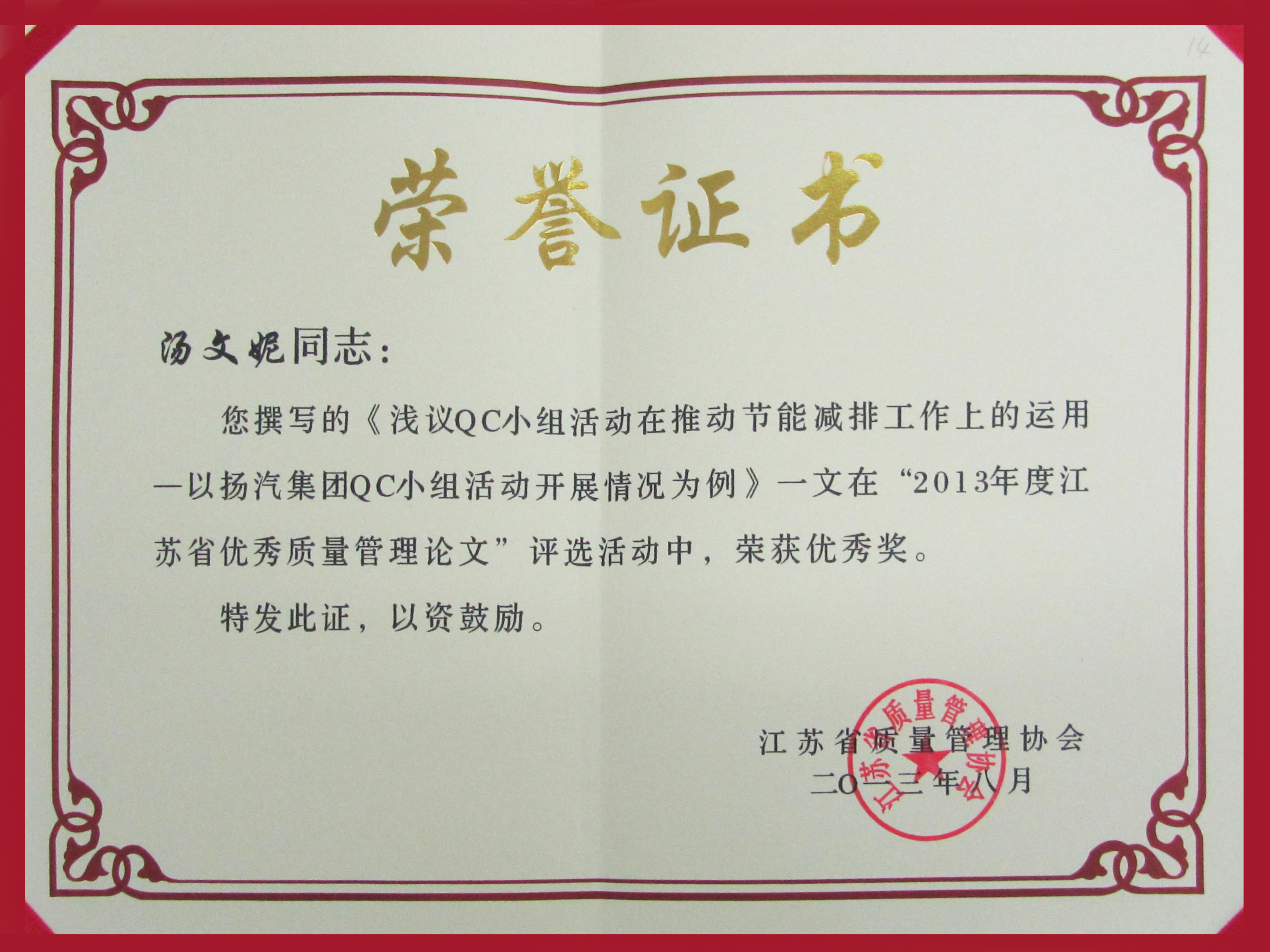 此外,集團(tuán)公司企業(yè)文化策劃處湯文妮的參賽論文《淺議QC小組活動(dòng)在推動(dòng)節(jié)能減排工作上的運(yùn)用——以揚(yáng)汽集團(tuán)QC小組活動(dòng)開展情況為例》在“2013年度江蘇省優(yōu)秀質(zhì)量管理論文”評選活動(dòng)中榮獲優(yōu)秀獎(jiǎng)。