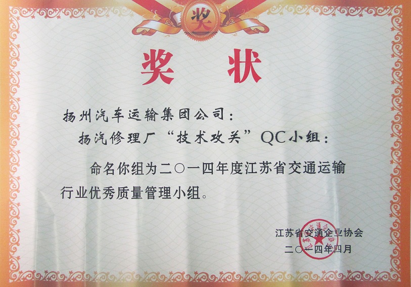 又訊:在此前進(jìn)行的江蘇省交通運(yùn)輸行業(yè)優(yōu)秀QC小組成果評選中,集團(tuán)公司被表彰為“省交通運(yùn)輸行業(yè)質(zhì)量管理小組活動優(yōu)秀企業(yè)”,揚(yáng)州汽車站“驛站快件”QC小組(成果《降低到達(dá)庫收發(fā)貨的誤差率》)與修理廠“技術(shù)攻關(guān)”QC小組(成果《汽車變速箱小車式托架的研制》)被評為“省交通運(yùn)輸行業(yè)優(yōu)秀質(zhì)量管理小組”。