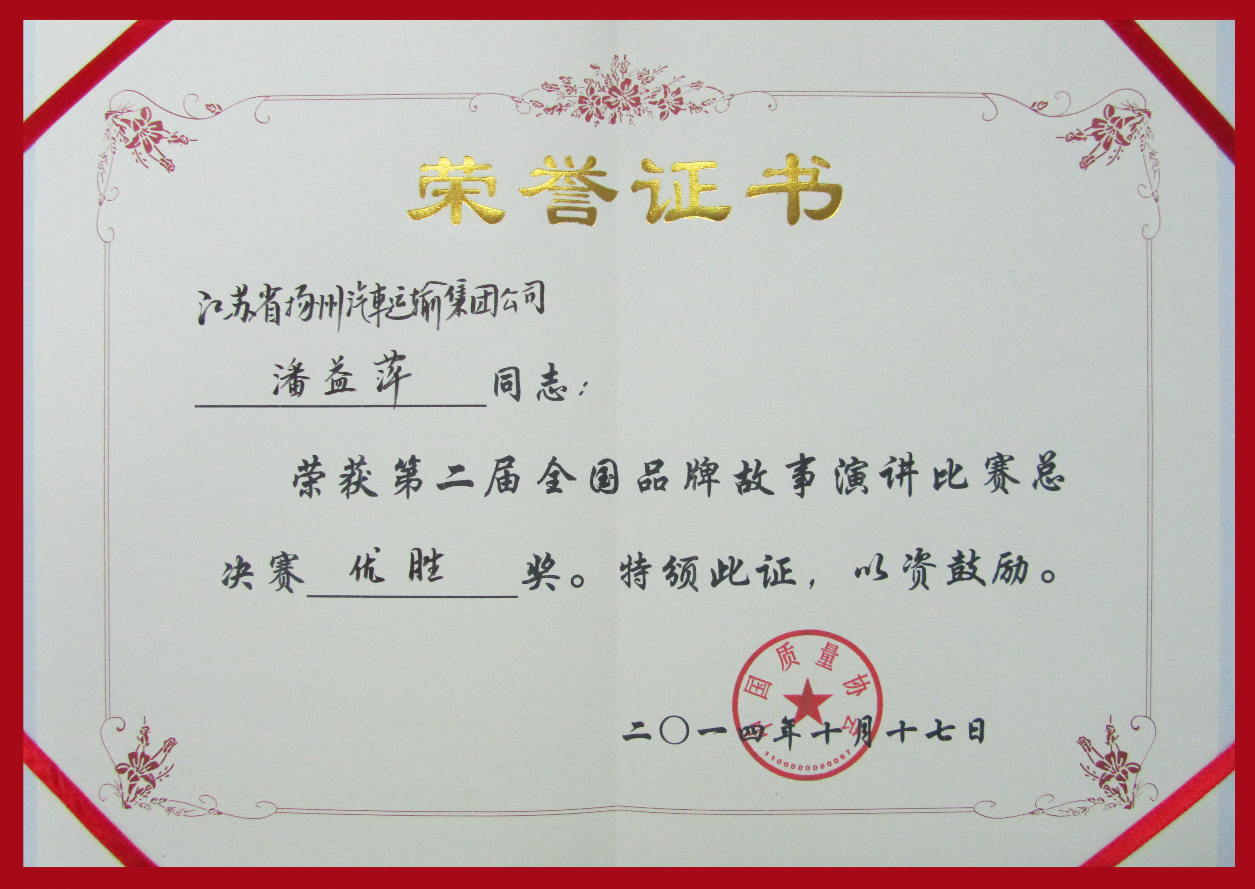 我司榮獲第二屆全國品牌故事演講比賽優(yōu)勝獎