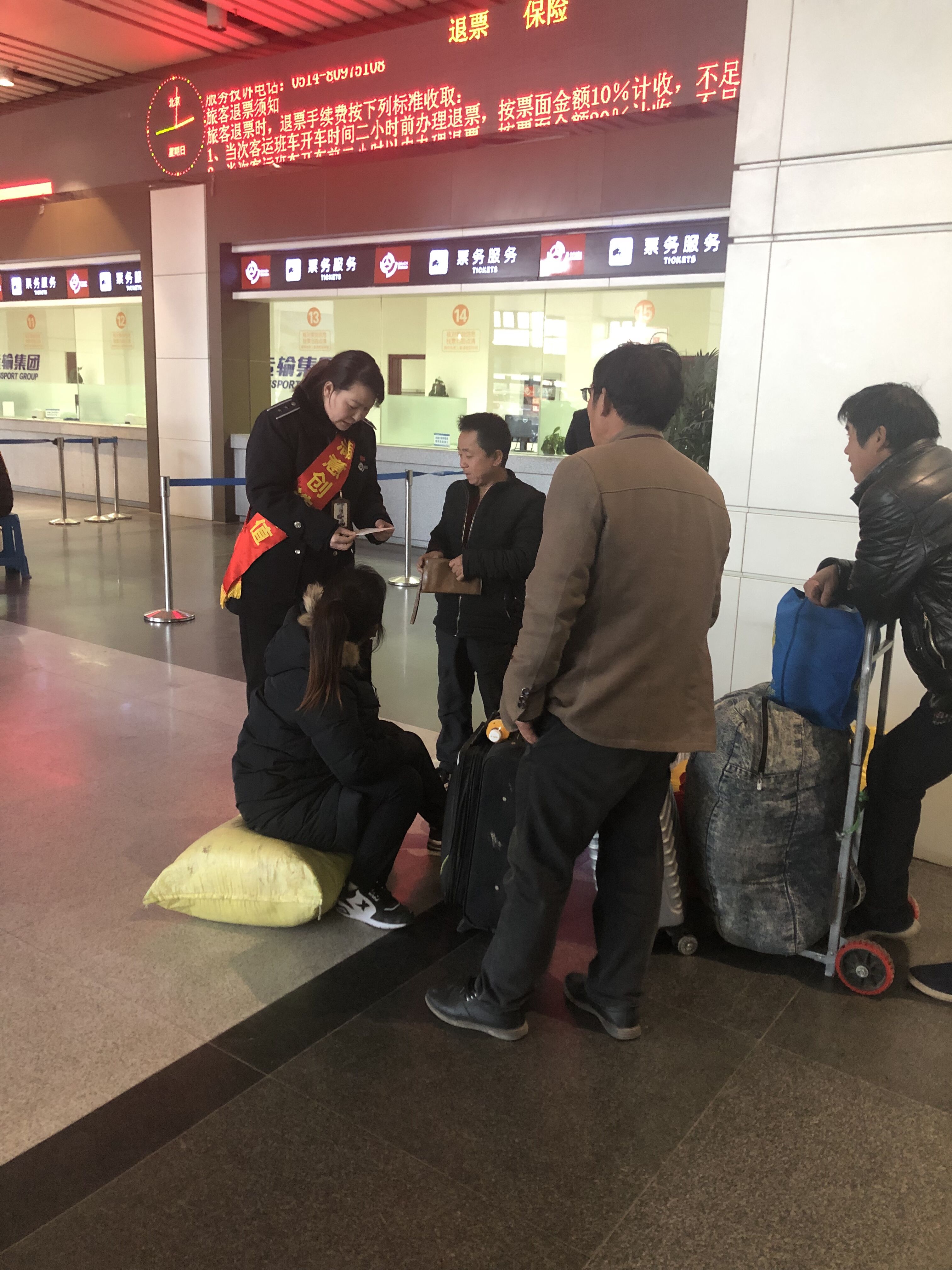 1月27日下午三點(diǎn),服務(wù)班班長尹海霞在現(xiàn)場巡查時(shí)發(fā)現(xiàn),售票大廳一角有四個(gè)農(nóng)民工模樣的旅客,望著眼前一大堆行李,說著外地方言,不停地議論著。