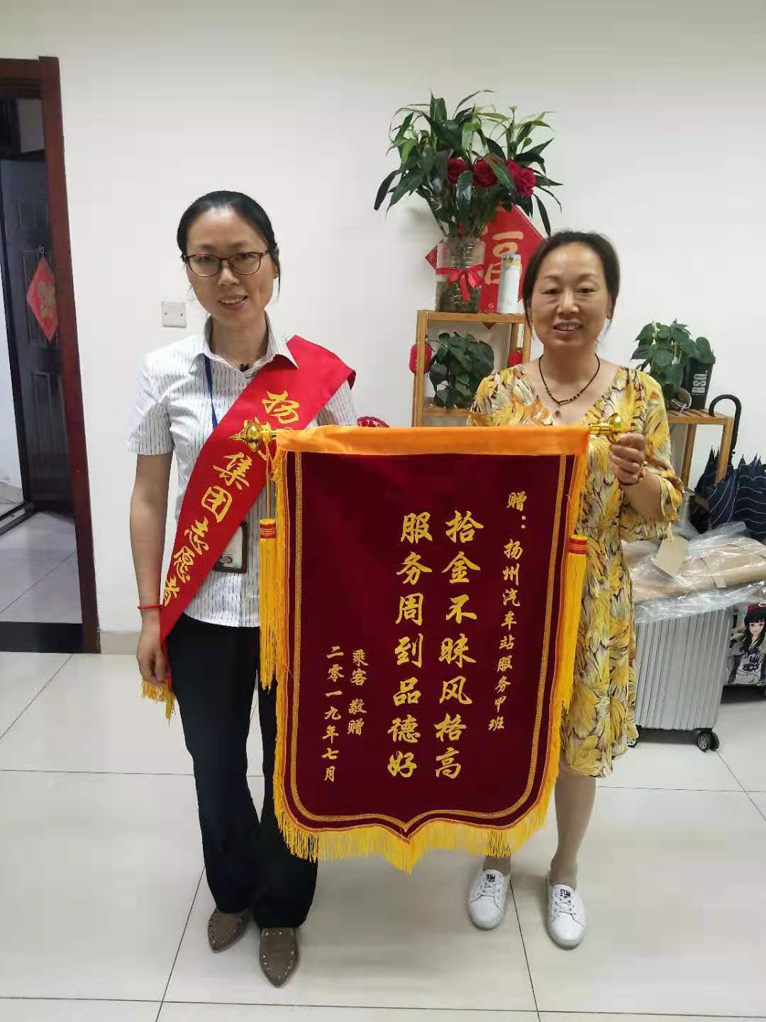 7月8日,一位揚州市民王大媽,拿著錦旗來到揚州汽車站值班室,感謝車站服務班工作人員,幫她尋找到遺失的錢包。