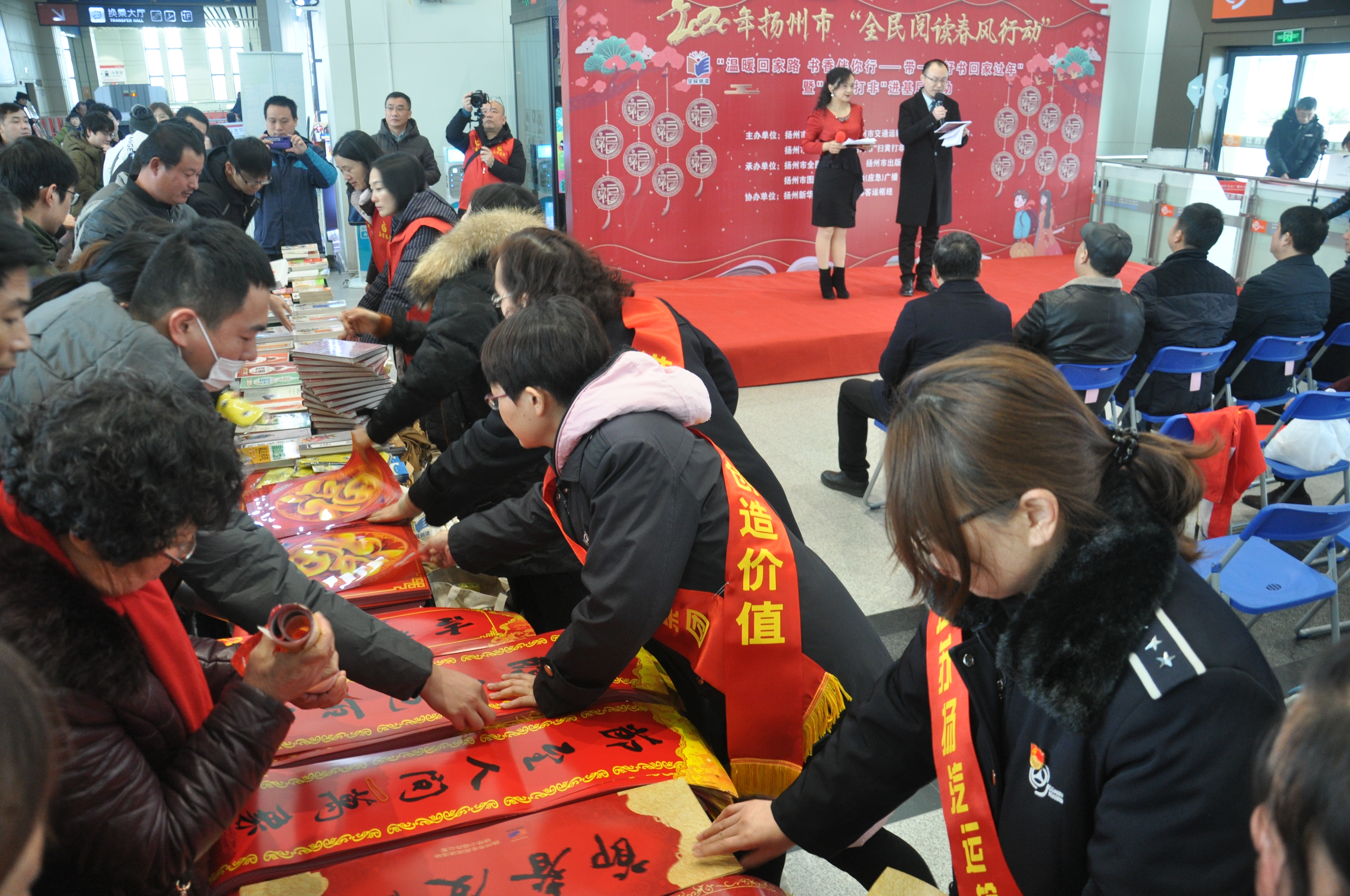 2020年1月14日上午,揚州市“全民閱讀春風(fēng)行動”暨“掃黃打非”進(jìn)基層活動在揚州汽車站候車大廳隆重舉行。