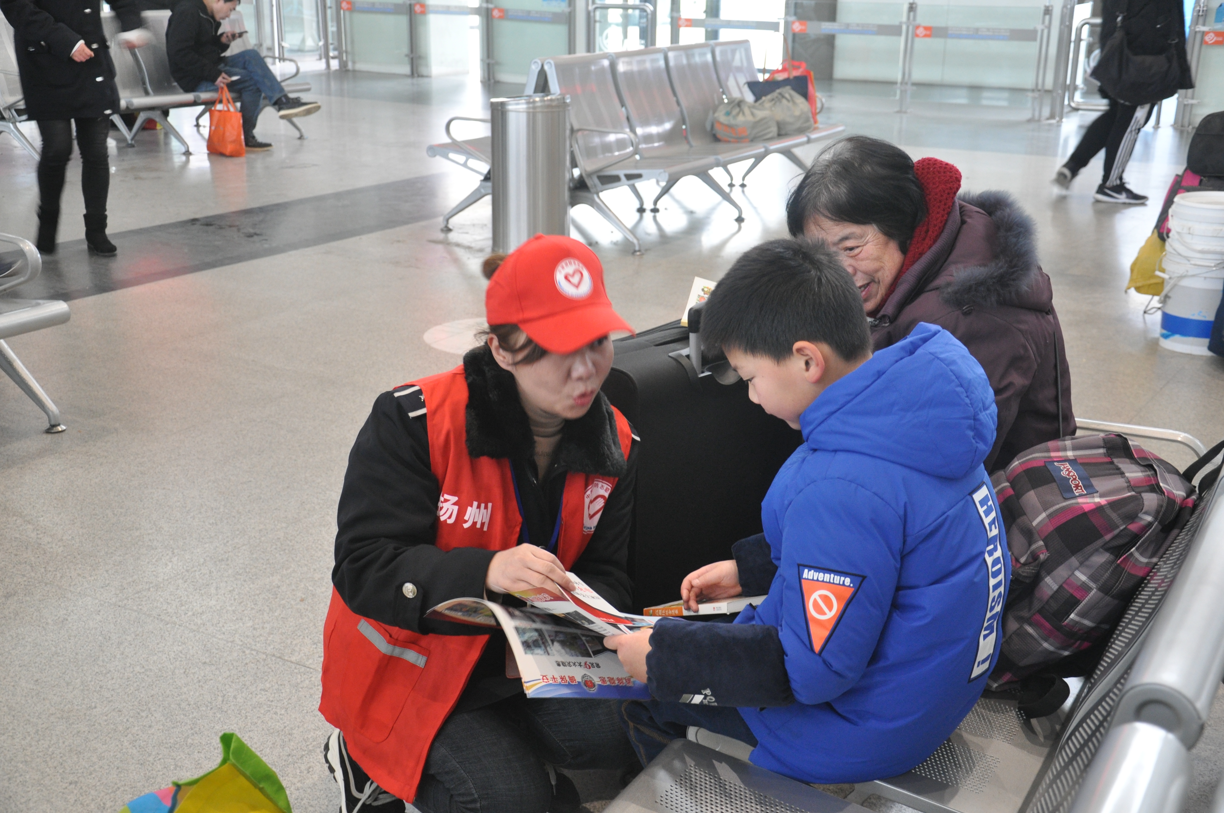 活動現(xiàn)場提供了種類繁多的書籍和春聯(lián),旅客們在宣傳臺前駐足,為孩子、親人或自己精心挑選,氣氛熱烈;顒蝇F(xiàn)場還安排了揚汽集團(tuán)志愿者向來往旅客進(jìn)行消防安全知識的宣傳和講解。