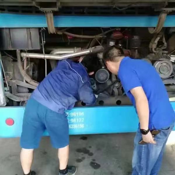 熱浪滾滾的場地上,已經(jīng)被汗水濕透了衣服的趙志明師傅,腳蹬保險(xiǎn)杠,趴在熱烘烘的引擎上檢修,一邊還叮囑一旁等候的校車駕駛員相關(guān)注意事項(xiàng)。