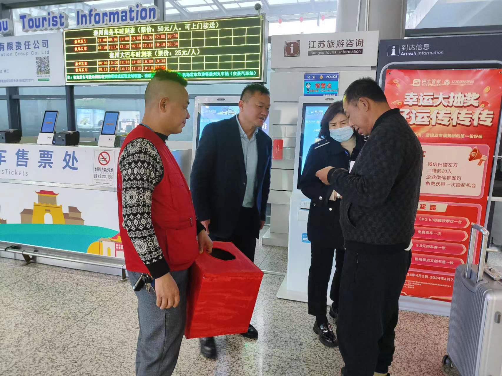 在抽獎活動現(xiàn)場,相關(guān)負(fù)責(zé)人與旅客進(jìn)行了交流互動,介紹了活動的主題和參與方式,講解了機(jī)場專線的運營模式和專線?空军c和走向,熱情地向旅客介紹了揚州的旅游景點,同時,認(rèn)真聽取了現(xiàn)場廣大旅客對機(jī)場專線建議。